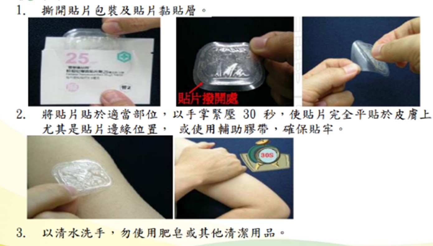 可貼於前胸、後背、上臂或大腿部位較不會因活動使貼片脫落處;若還是發生,可以在黏貼時用輔助膠帶加強。 - 每片可貼 3 天,撕下舊的貼片,對折那一面,放入原來的包裝袋中,不可丟棄。登記貼上及撕下的日期、時間及給藥人姓名。